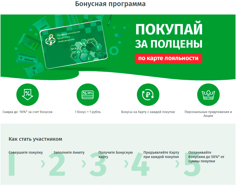 АС «Фармакон» запустила Бонусную программу лояльности. С Картой любой аптеки, входящей в состав АС «Фармакон», Вам будут начисляться Бонусы за покупки. Вы сможете участвовать в Акциях для владельцев Карт и получать специальные предложения. Накопленные Бонусы можно списывать в счет оплаты: до 50% стоимости покупки (1 Бонус = 1 рубль).