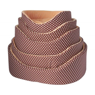 Лежак с бортиком из мебельного поролона и съемной подушкой, которая набита пушистым Холлофайбером. Борт снаружи 100% Хлопок коричневого цвета со светлым горохом, а внутри мех искусственный плюшевый