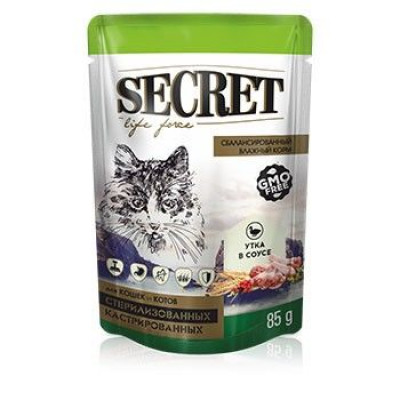 СЕКРЕТ ФО ПЕТС ЛАЙФ ФОРС ПАУЧ Д/СТЕРИЛ.КОШЕК И КАСТРИР.КОТОВ КУСОЧКИ В СОУСЕ С УТКОЙ 85Г. /АРТ.5104/ (ВЕТ.) [SECRET FOR PETS LIFE FORCE]