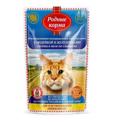 РОДНЫЕ КОРМА КОРМ ВЛАЖН. Д/КОШЕК ИНДЕЙКА+ЖЕЛУДОЧКИ КУСОЧКИ В ЖЕЛЕ ПО-СЛАВЯНСКИ 85Г. (ВЕТ.)