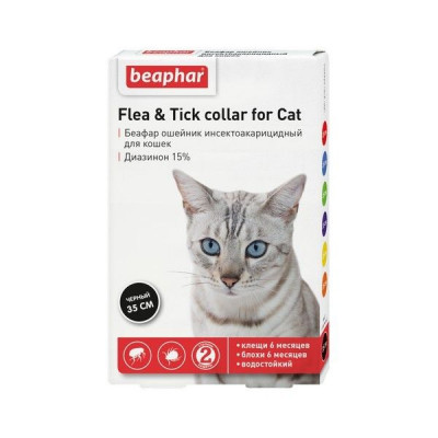 Ошейник от блох и клещей для кошек с 6 месячного возраста. Цвет черный. Уничтожает паразитов и защищает от повторного заражения блохами и клещами в течение 6 месяцев. Средство 2-й ступени комплексной программы Beaphar по защите от паразитов. Диазинон в составе ошейника обладает несистемным действием. Диазинон выделяется с поверхности ленты, переносится на кожно-волосяной покров животного и накапливается в эпидермисе, волосяных луковицах, сал