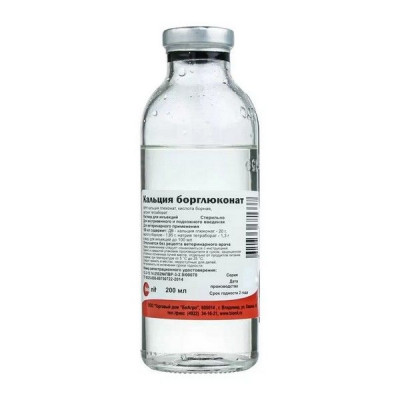 "В 100 мл лекарственного препарата содержится: 20,0 г кальция глюконата, 1,85 г кислоты борной, 1,3 г натрия тетрабората или натрия тетраборнокислого 10-водного, воды для инъекций – до 100 мл. По внешнему виду препарат представляет собой прозрачную бесцветную или светло-желтого цвета жидкость.