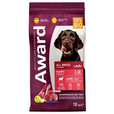 Сухой корм AWARD для щенков от 1 месяца, беременных и кормящих сук всех пород с ягненком и индейкой с добавлением яблока и черники 12 кг.