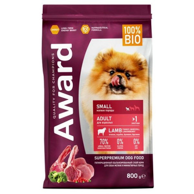 Сухой корм AWARD для взрослых собак мелких и миниатюрных пород с ягненком и индейкой с добавлением брокколи и брусники 800 г.