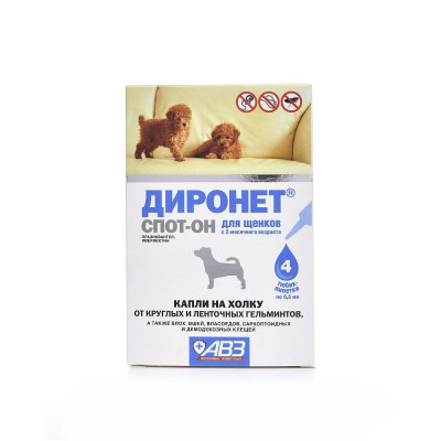 «Диронет спот-он» назначают щенкам, старше 2-месячного возраста с целью лечения и профилактики кишечных нематодозов, цестодозов, энтомозов, отодектоза, саркоптоза, нотоэдроза и демодекоза